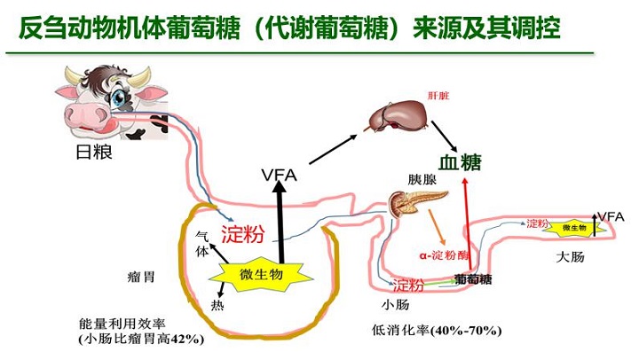 反芻動物70%-80%的能量來源于揮發(fā)性脂肪酸(VFA),飼料中的碳水化合物如淀粉、果膠、果聚糖、可溶性糖、纖維素、半纖維素和木質(zhì)素,在瘤胃中被微生物降解產(chǎn)生能量、氣體(甲烷、二氧化碳)、熱量和酸。乙酸、丙酸和丁酸均屬于揮發(fā)性脂肪酸,它們構(gòu)成了瘤胃中產(chǎn)生的絕大部分酸(95%)。大部分丙酸在肝臟中被轉(zhuǎn)化成葡萄糖。另一方面,過瘤胃淀粉經(jīng)過淀粉酶的分解產(chǎn)生葡萄糖,通過小腸吸收進入血液。